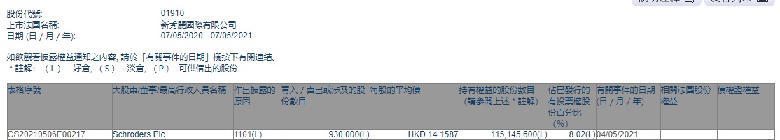 智通财经APP获悉,香港联交所最新资料显示,5月4日,Schroders Plc增持新秀丽(01910)93万股,每股作价14.1587港元,总金额约为1316.76万港元。增持后最新持股数目约为1.15亿股,最新持股比例为8.02%。