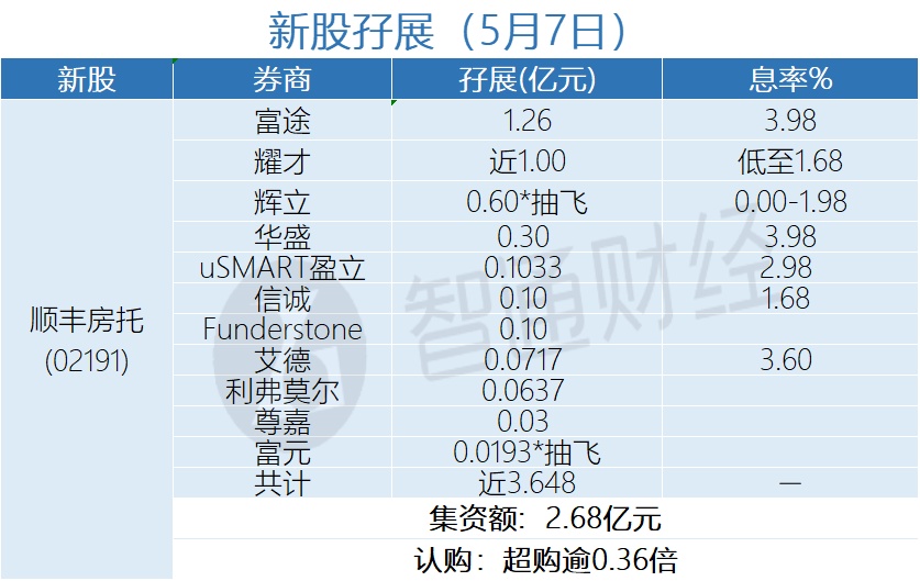 智通财经APP获悉,顺丰房托(02191)正在招股中。截至5月7日,辉立、耀才等合计为其借出近3.648亿港元,超购逾0.36倍。