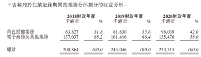 德盈控股招股书显示,公司主要从事角色授权业务和电子商务及其他业务。具体来看,角色授权业务指的是公司跨多个渠道创建、设计及授权自创的B.Duck家族角色,以及对这些角色进行品牌管理及营销。2018年-2020年,德盈控股的角色授权收入分别为6382.7万港元、8163万港元、9803.9万港元,占营收的比重为31.8%、33.6%、42%。