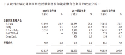 以角色授权业务而论,2018年-2020年,德盈控股的五个核心角色B.Duck、Buffy、B.Duck Baby、Bath’N Duck、Dong Duck便贡献了该业务的全部收入。而其中B.Duck吸金能力更是强劲,2018年-2020年分别实现收入5389.2万港元、6155.5万港元、7503.5万港元,分别占到同期角色授权业务收入的84.4%、75.4%、76.5%。