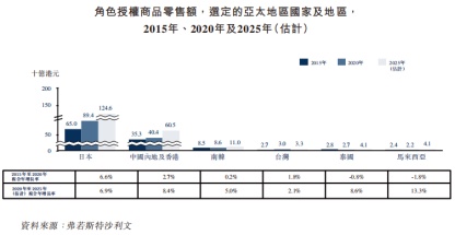 先来看角色授权业务,招股书显示,德盈控股的这部分收入主要来源于中国内地及香港地区。而根据弗若斯特沙利文资料显示,2015年-2020年该区域的角色授权商品零售额由353亿港元增长至404亿港元,复合年增长率约为2.7%,并有望在2025年提升至605亿港元,预计复合年增长率达到8.4%。横向对比亚太区域其他国家,中国内地及香港的角色授权商品零售额增速有望超过日本,而后者在2015年-2020年是亚太区增速最快的地区。