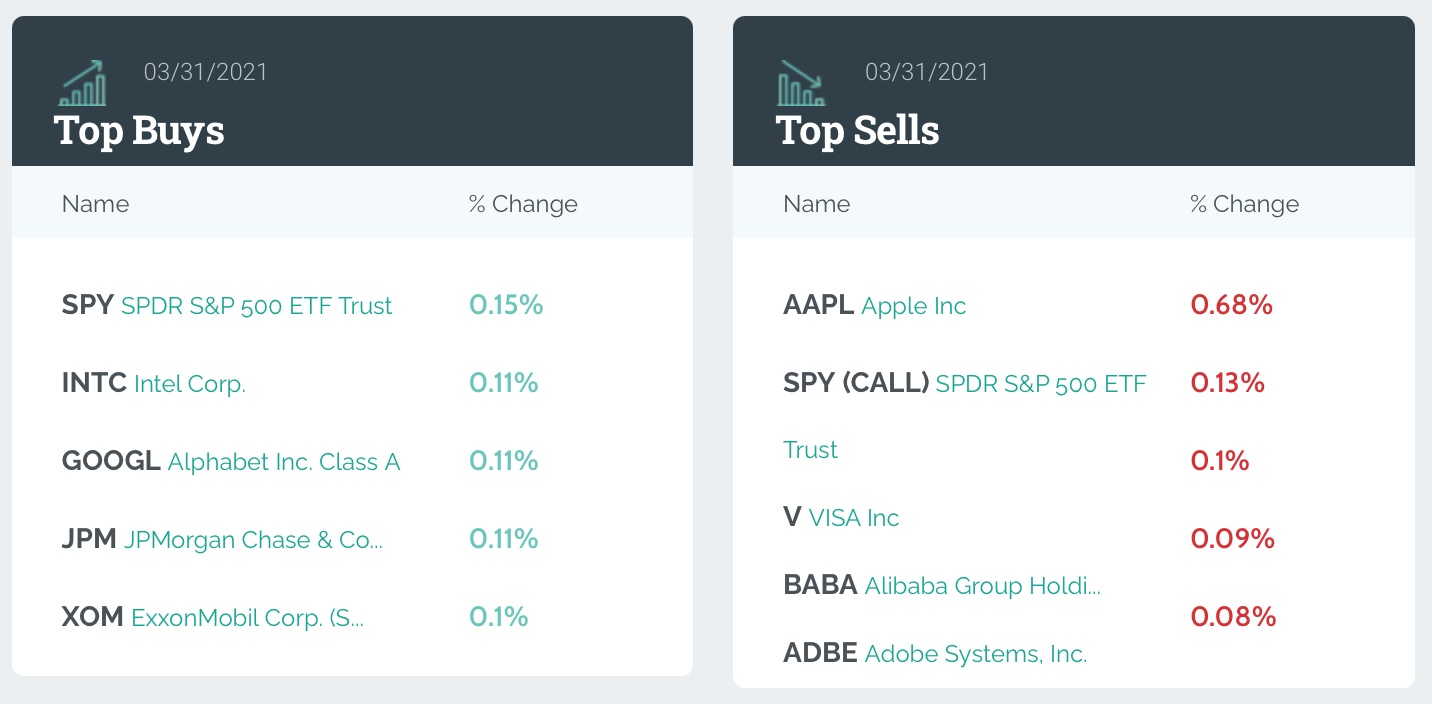 前五大卖出标的分别是:苹果(AAPL.US)、标普500指数ETF看涨期权(SPY.US,CALL)、Visa(V.US)、阿里巴巴(BABA.US)和Adobe(ADBE.US)。