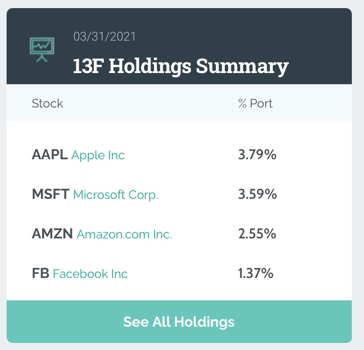 Facebook(FB.US)位列第四,占比达1.37%,上季度占比为1.39%;持仓约1.58亿股,较上季度持仓数量减少约170.9万股,目前持仓市值约465.2亿美元。