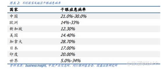 根据同仁眼科基金会的数据汇总,美国的流行病学调查在48岁以上的人群中,有14.4%患有干眼。加拿大的13517例问卷调查结果显示,28.7%的人群有眼干症状。日本筛查了2127例正常人群,发现有17%患有干眼。印度流行病学调查表明,在30~40岁人群中,有超过20%的人患有干眼;而在70岁以上的人群中,干眼的患病率则高达36.1%。在台湾地区65岁以上的人群中,有33.7%患有干眼。根据我国的患病率及流行病学数据(21-30%患病率),我国干眼症患者基数庞大,有2-3亿患者人群。