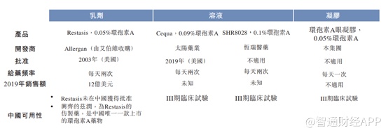 招股书显示,环孢素A眼凝胶为干眼病用药。干眼症发病原因比较复杂,与生活工作环境、长期使用某些药物和化妆品(比如隐形银镜和美瞳)等都有关系,上班族长期盯着屏幕也是诱发干眼症的重要因素。