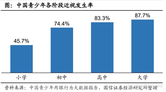 而在需求方面,却逐年攀升。国信证券研报指出“学习时间长+户外活动少”造成中国青少年各阶段近视发生率不断上升,根据中国青少年用眼大数据报告显示,我国小学生近视率高达45.7%,并且随着学历的增长,近视率也逐渐增加,我国高中生近视率更是高达83.3%。