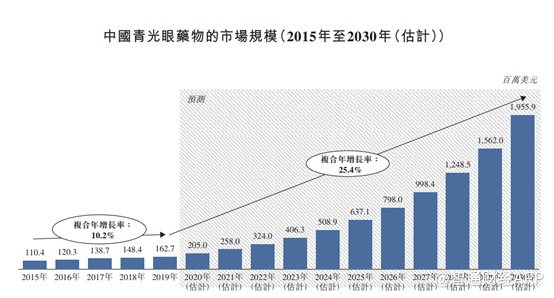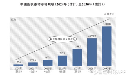 庞大的受众群体,使得中国近视药物的市场规模预计将由2024年的1.26亿美元增至2030年的30亿美元(中国首款近视药物预期将于2024年获批),复合年增长率高达69.6%。