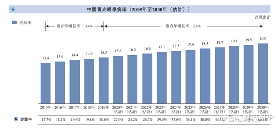 青光眼是全球第二位的致盲因素,是一种与高眼压导致视神经损伤相关的慢性及渐进性的疾病。眼内房水产生与房水排放比率决定眼压。几乎所有的青光眼均为原发性青光眼,并通常可分为开角型青光眼及闭角型青光眼两类。在中国,约40%的原发性青光眼为开角型青光眼。在中国,青光眼患者的数量由2015年的1340万人增至2019年的1530万人,受人口老龄化加速推动,预计在2030年将进一步增至2000万人。此外,青光眼的诊断率预期将由2019年的20.0%大幅上升至2030年的60.6%。