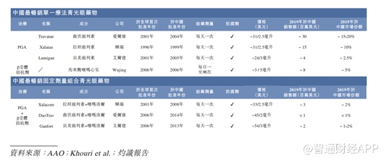 目前中国最畅销的青光眼药物包括单一疗法的PGA药物及β受体拮抗剂以及在一个单一剂型中结合PGA及β受体拮抗剂的固定剂量组合滴眼液。根据医学指引,单一疗法滴眼液被推荐作为一线治疗,固定剂量组合滴眼液用于病情恶化或使用单一疗法药物后未能达到目标眼压的患者。与单独使用PGA及β受体拮抗剂相比,固定剂量组合滴眼液减少使用滴眼液的总次数,提升方便性及患者的遵医嘱性,降低因后续滴药导致的洗除效应且具有较低的眼表暴露及毒性。