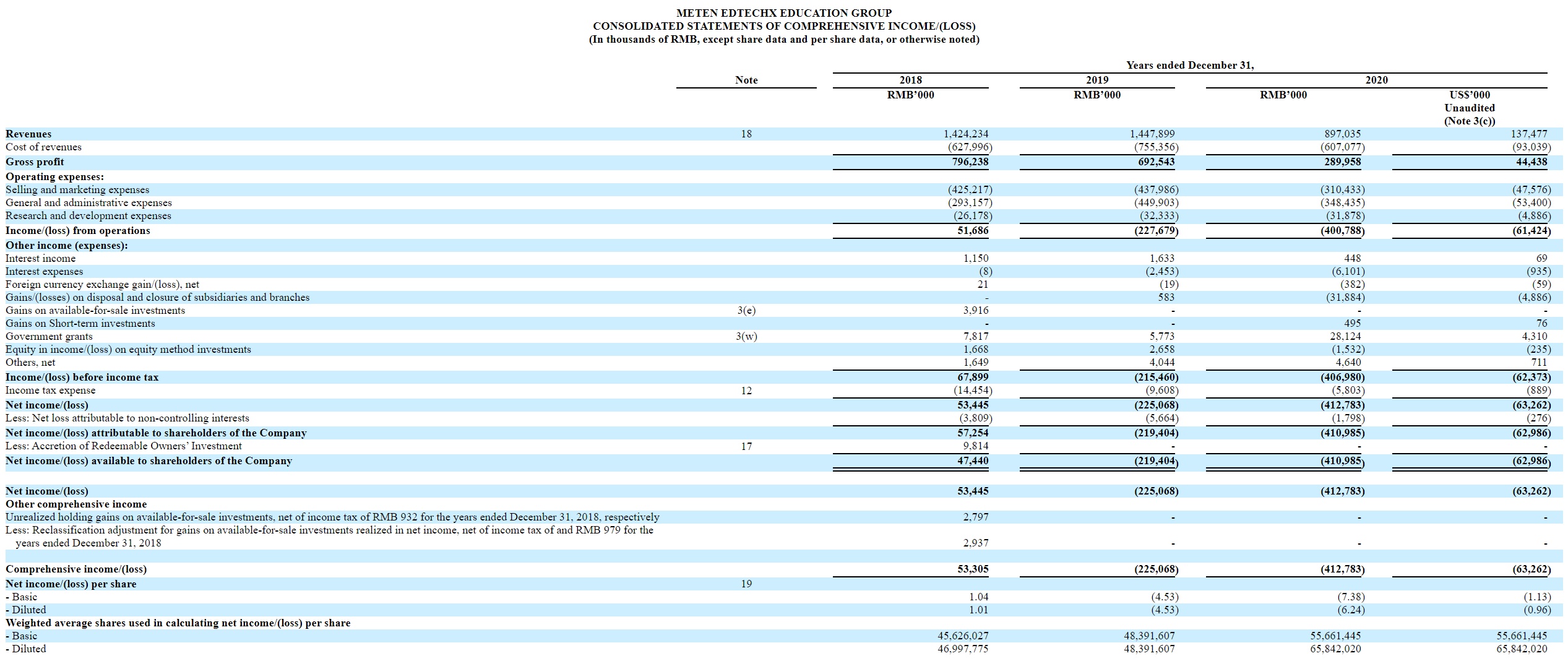 智通财经APP获悉,美联国际教育集团(METX.US)向美国SEC递交了20F报告,披露了公司截至2020年12月31日的2020年年报和最新股权结构。财报显示,该公司营收为8.97亿元(人民币,下同),同比下降38%。