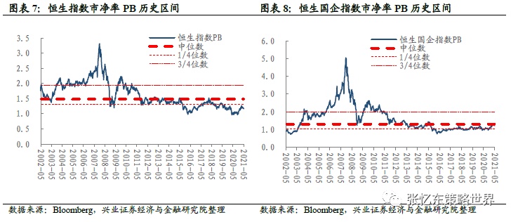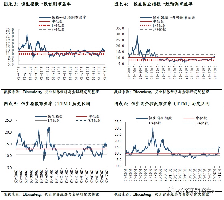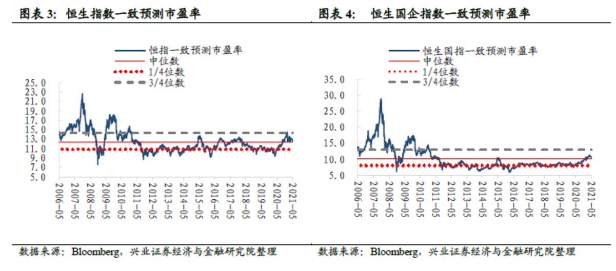 恒指预测PE(一致预期)为12.6倍,恒生国指预测PE为10.5倍,均处于2005年7月以来的中位数和3/4分位数之间。