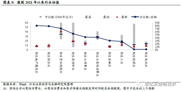 地产建筑业(81%)、综合业(79%)、资讯科技业(71%)、原材料业(54%)、公用事业(42%)、必需性消费业(41%)、金融业(31%)、工业(28%)、能源业(2%)、电讯业(2%)(注:行业括号内百分比数值为2011年以来行业最新市盈率所在分位数)。