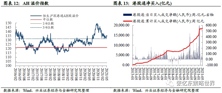 本周港股通成交占主板成交金额的比重为13.54%,高于上周的11.56%。截至5月7日,AH溢价指数为134.9,低于上周收盘的135.6,高于2005年以来的3/4分位数。