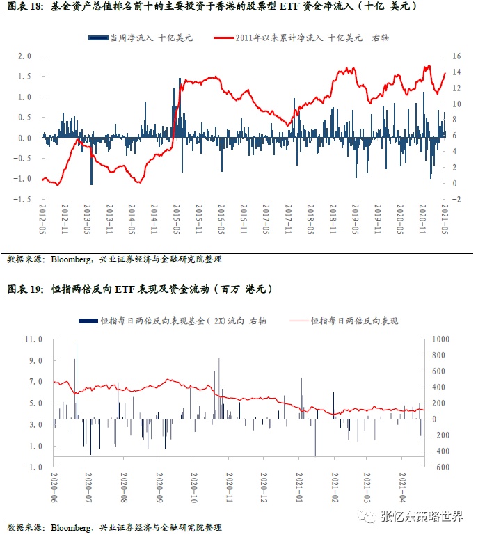 截至5月7日,根据统计,本周主要投资于香港的股票型ETF基金中,基金资产总值前十大ETF净流入资金1.58亿美元;本周恒指两倍反向ETF净流出资金2.58亿港元