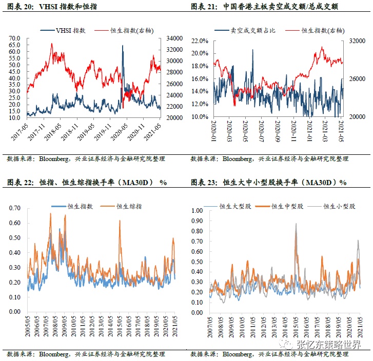 投资者情绪:截至5月7日,恒生波指为17.3,高于上周收盘的16.9,处于2012年以来的43%分位数水平;主板周平均卖空成交比为13.2%,高于上周收盘的12.4%;截至5月7日,30日移动平均换手率方面,恒生综指为0.23%,处于2005年以来的54.3%分位数水平,恒生小型股换手率(0.29%)和恒生中型股换手率(0.28%)大于恒生大型股换手率(0.24%)。