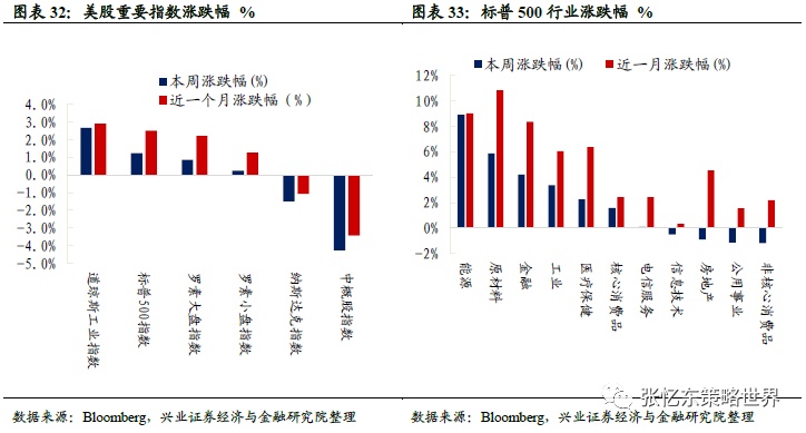 股指表现:本周道琼斯工业指数(涨2.7%)、标普500指数(涨1.2%)和罗素大盘指数(涨0.9%)领涨,罗素小盘指数上涨0.2%,中概股指数下跌4.3%,纳斯达克指数下跌1.5%。行业上,能源(涨8.9%)、原材料(涨5.9%)和金融(涨4.2%)领涨,非核心消费品(跌1.2%)、公用事业(跌1.1%)和房地产(跌0.9%)领跌。