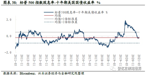 核心消费品(99%)、工业(98%)、房地产(97%)、非核心消费品(97%)、公用事业(96%)、电信服务(85%)、能源(82%)、信息技术(80%)、金融(78%)、原材料(73%)和医疗(47%)。(注:括号内百分比数值为对应行业预测市盈率于1990年以来的分位数)截至5月7日,标普500指数股息率与十年期美国国债收益率之差为-0.22%,处于2010年以来的均值与1倍标准差下限之间。