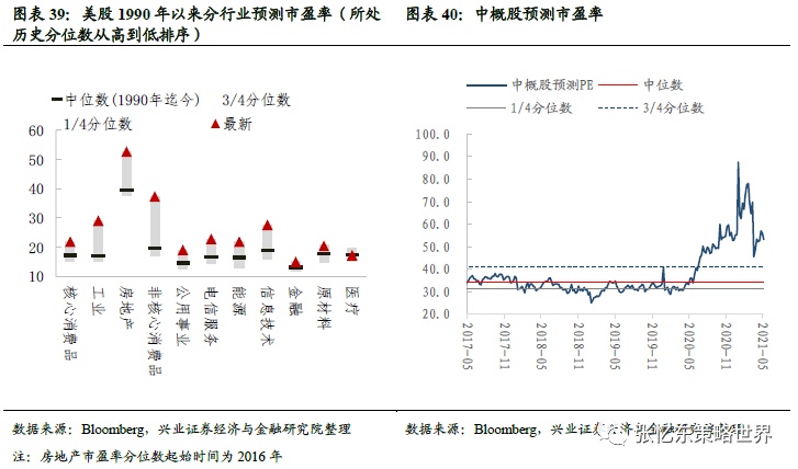 截至5月7日,标普500市盈率(TTM)为30.4倍,高于上周收盘的30.0倍,高于1990年以来的3/4分位数。行业估值特征如下: