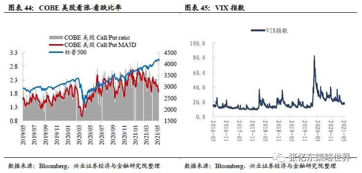 投资者情绪:1)美股个股看涨/看跌期权成交量比例5日移动平均为1.9,低于上周五的2.1,位于近五年以来的83%分位数水平;2)截至5月7日,VIX指数为16.7,低于上周收盘的18.6,处于1990年以来的62%分位数水平。