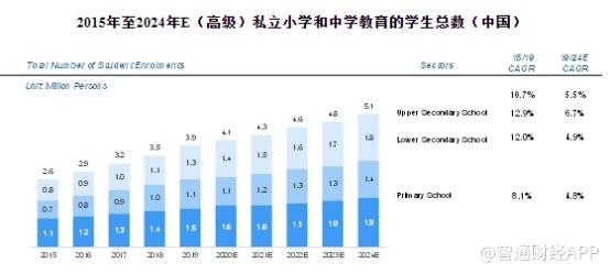 数据显示,目前高端私立中小学的学生入学人数约占中国私立中小学学生总数的20%。从2015年到2019年,就读于高级私立中小学的学生人数从260万增至390万,复合年增长率约为10.7%。高中是增长最快的部分,复合年增长率约为12.9%。