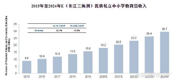 该地区优质私立中小学教育的总收入从2014年的人民币90亿元增加到2019年的158亿元,复合年增长率约为15.1%。预计到2024年,该收入将增长至297亿元,这主要是由于长三角地区居民可支配收入和教育支出的增加。