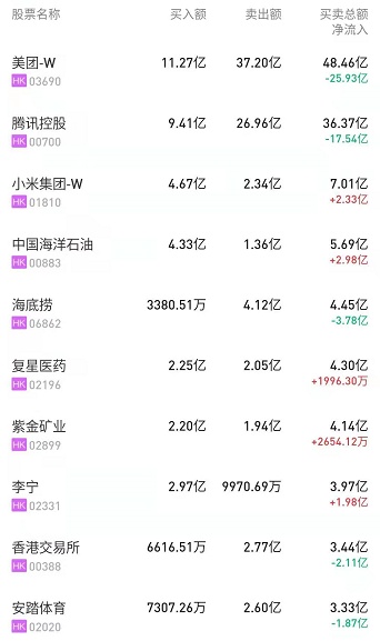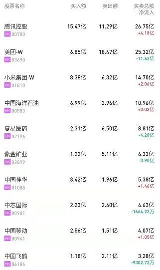 此外,中国移动(00941)获净买入1.05亿港元。紫金矿业(02899)、港交所(00388)、中国飞鹤(06186)分别遭净卖出3.63亿、2.11亿、9302万港元。
