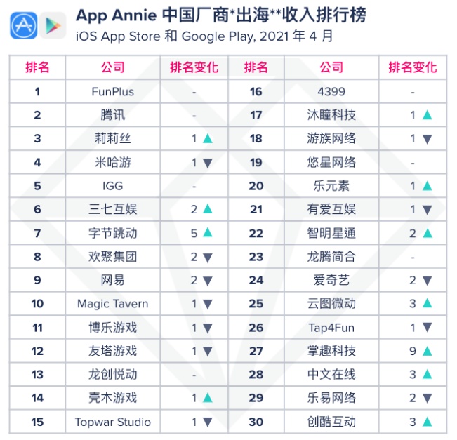 智通财经APP获悉,据App Annie数据显示,2021年4月出海发行商收入榜单中,Funplus凭借旗下多款游戏的优异表现稳居收入榜第一。依靠PUBG MOBILE全球收入第一的稳定表现,腾讯(00700)继续保持在出海收入榜第二。