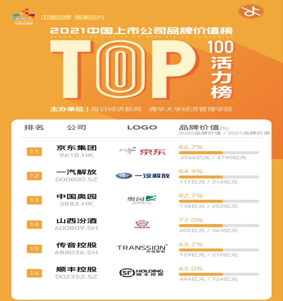 品牌价值是企业抗风险能力的重要衡量指标,与往年相比,今年每日经济新闻隆重推出的年度“活力榜TOP100”,通过对2021年品牌价值大于200亿的上市公司按其品牌价值增长率进行排序,以呈现近年来高速发展企业的品牌价值成长性,特别是疫情期间的企业增长活力。