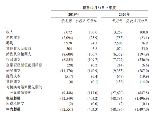 截至12月31日止的2019和2020年度,该公司收入分别为807.2万美元和325.9万美元。同期净亏损分别为3255.1万美元和4878.6万美元。招股书显示,该公司2020年研发支出为935.3万美元,同比降低18%。