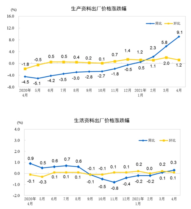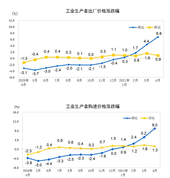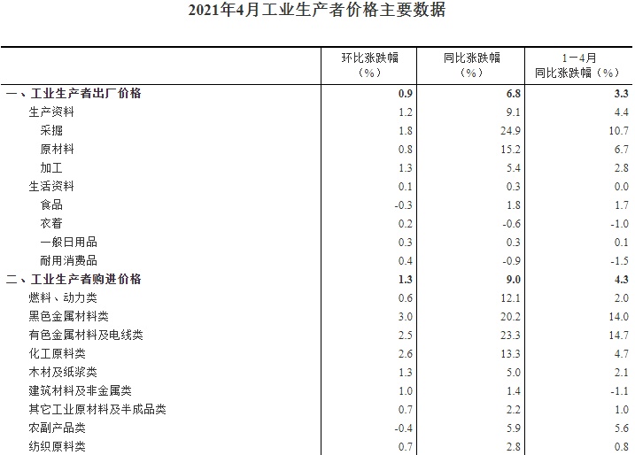 智通财经APP获悉,5月11日,国家统计局公布,2021年4月份,全国工业生产者出厂价格同比上涨6.8%,环比上涨0.9%;工业生产者购进价格同比上涨9.0%,环比上涨1.3%。1—4月平均,工业生产者出厂价格比去年同期上涨3.3%,工业生产者购进价格上涨4.3%。