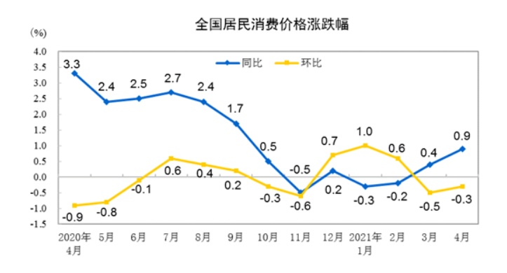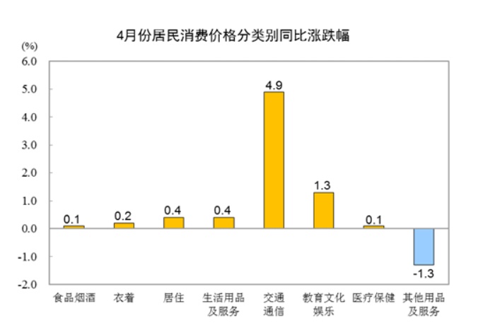 4月份,全国居民消费价格环比下降0.3%。其中,城市下降0.2%,农村下降0.5%;食品价格下降2.4%,非食品价格上涨0.2%;消费品价格下降0.7%,服务价格上涨0.4%。