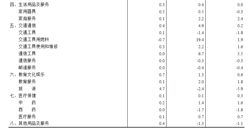 其他七大类价格同比六涨一降。其中,交通通信、教育文化娱乐价格分别上涨4.9%和1.3%,居住、生活用品及服务价格均上涨0.4%,衣着、医疗保健价格分别上涨0.2%和0.1%;其他用品及服务价格下降1.3%。