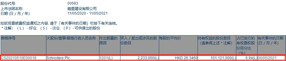 智通财经APP获悉,香港联交所最新资料显示,5月6日,Schroders Plc减持嘉里建设(00683)223.3万股,每股作价26.346港元,总金额约为5883.06万港元。减持后最新持股数目为1.01亿股,最新持股比例为6.94%。