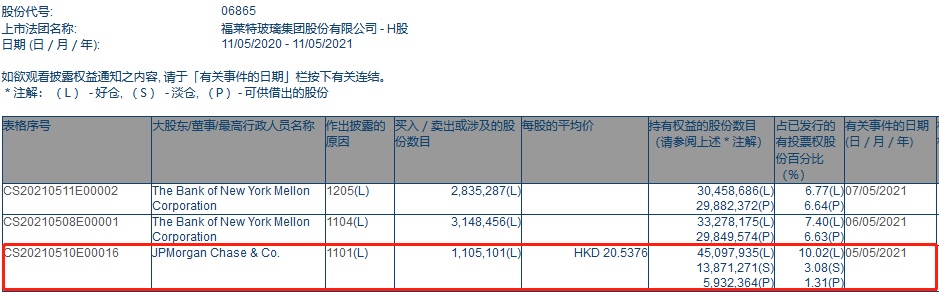 智通财经APP获悉,香港联交所最新资料显示,5月5日,摩根大通增持福莱特玻璃(06865)110.5101万股,每股作价20.5376港元,总金额约为2269.61万港元。增持后最新持股数目约为4509.79万股,最新持股比例为10.02%。