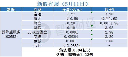 智通财经APP获悉,新希望服务(03658)正在招股中。截至5月11日,辉立、耀才等合计为其借出近2.08814亿港元,超购逾1.22倍。