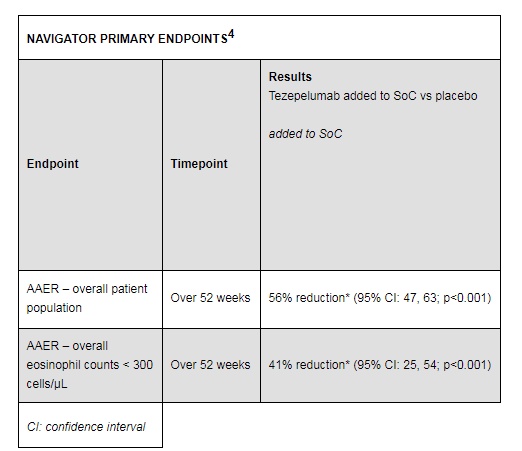 本次BLA 是基于 PATHFINDER 临床试验阳性结果的支持,包括关键性3期临床 NAVIGATOR。该试验结果显示,与安慰剂相比, Tezepelumab 在降低重度、不受控制的哮喘患者的年平均哮喘急性发作率(AAER)上具有统计学和临床意义。在 2 期和 3 期临床试验中,不论基线嗜酸性粒细胞计数多少,不论患者表型或 T2 生物标志物状态,Tezepelumab 是唯一能够持续显着降低广泛重度哮喘患者 AAER 的生物制剂。Tezepelumab最常见的不良反应是鼻咽炎、上呼吸道感染和头痛。