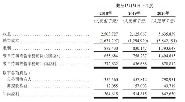 2018年-2020年,中亿基业的收入分别为25.04亿元、21.25亿元及56.36亿元,复合年增长率为50.0%。净溢利由2018年的3.65亿元按复合年增长率52.0%增长至2020年的人民币8.43亿元。
