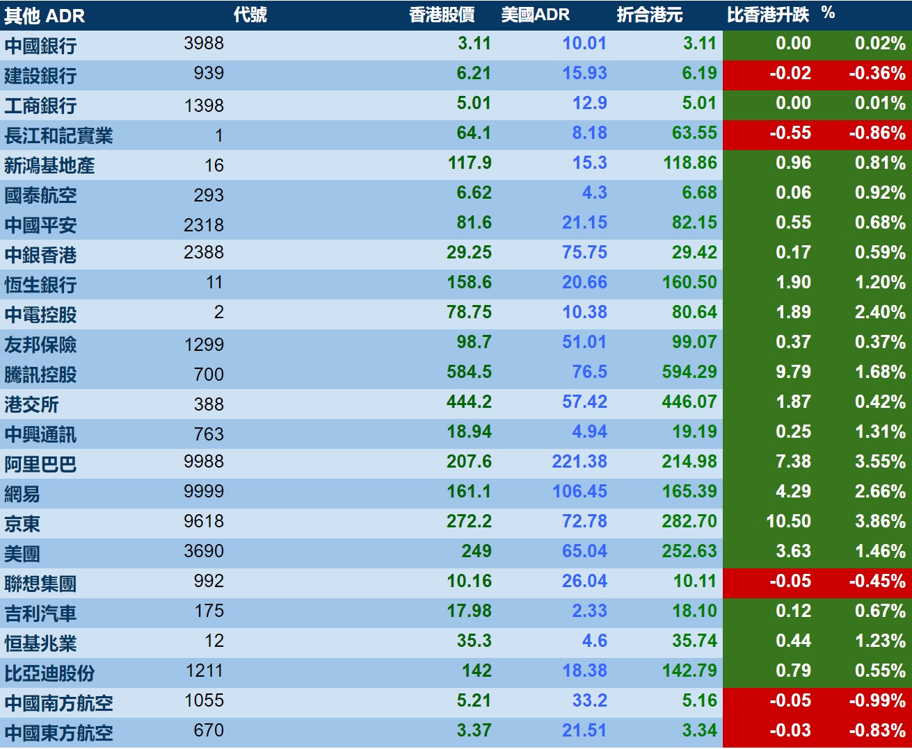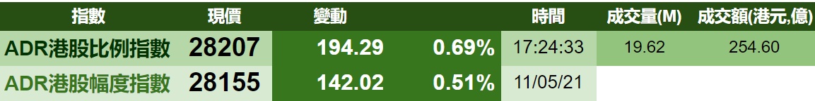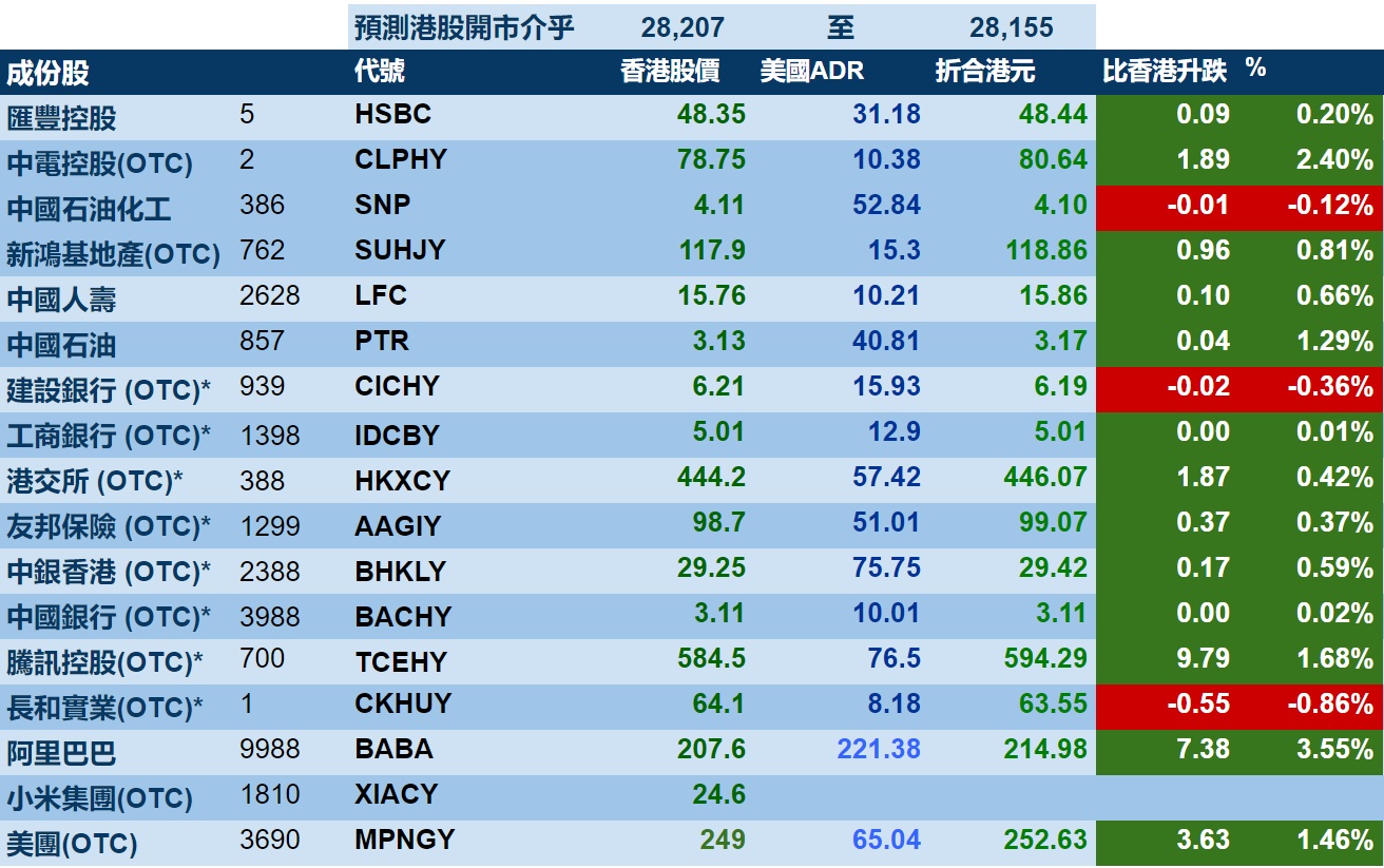 智通财经APP获悉,周二美股三大指数齐跌,港股ADR指数上涨,按比例计算,收报28207点,涨194.29点或0.69%。