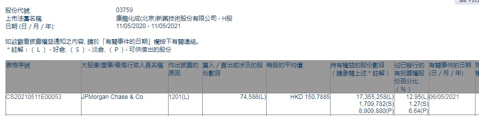 智通财经APP获悉,香港联交所最新资料显示,5月6日,摩根大通减持康龙化成(北京)新药技术股份有限公司(03759)7.4586万股,每股作价150.7885港元,总金额约为1124.67万港元。减持后最新持股数目约为1735.53万股,最新持股比例为12.95%。