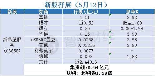 智通财经APP获悉,新希望服务(03658)正在招股中。截至5月12日,辉立、耀才等合计为其借出近2.44016亿港元,超购逾1.59倍。