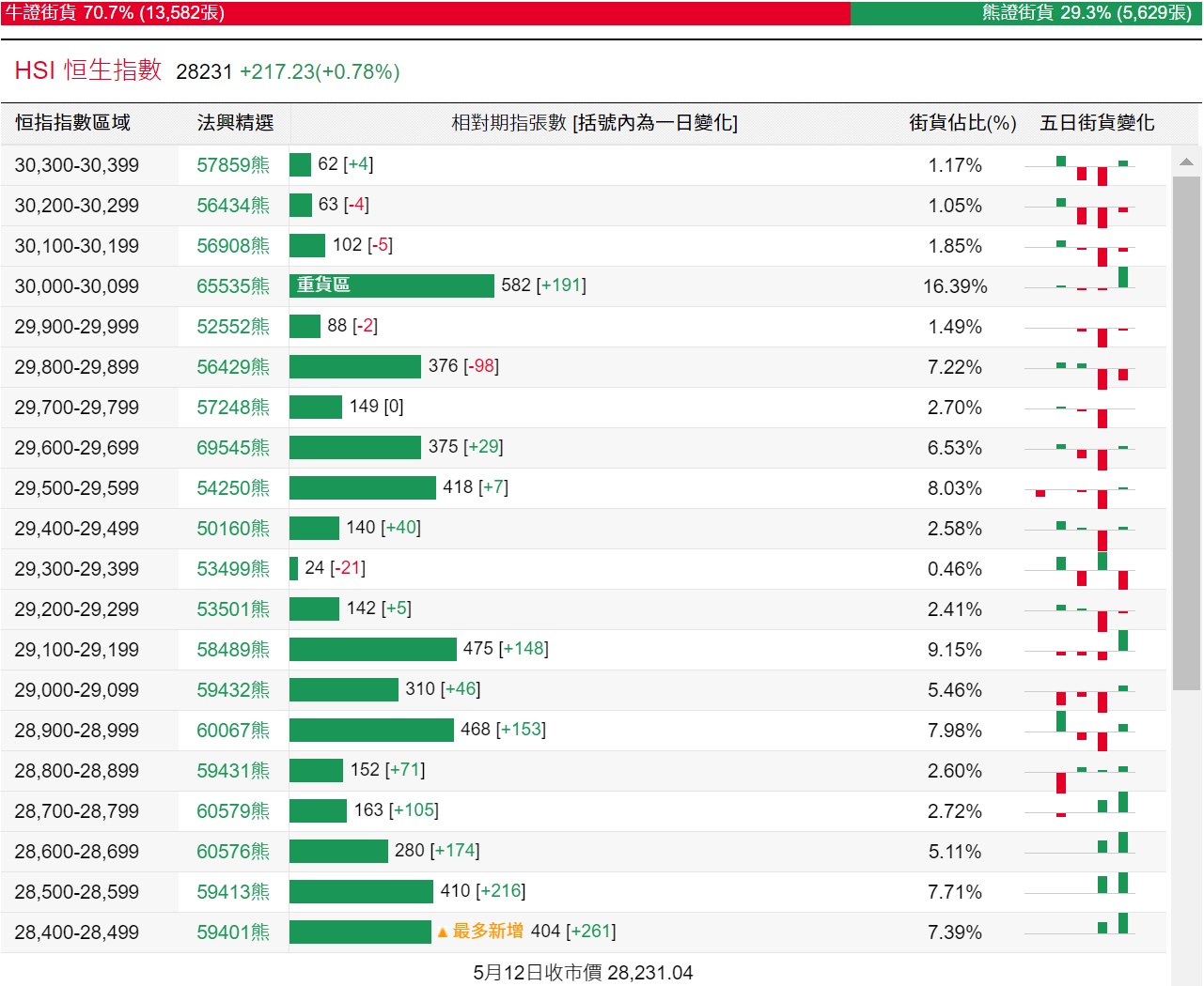 智通财经APP获悉,截至5月12日,恒指最新的牛熊街货比例为71:29。