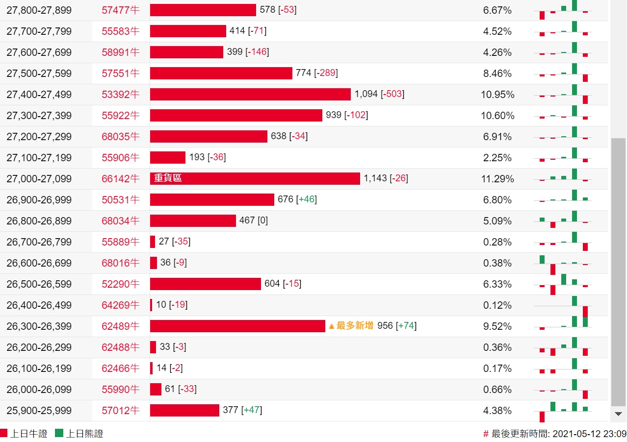 牛证街货重货区在27000-27099区间,该区间最新牛证数量为1143张,较上一交易日减少26张;最多新增在26300-26399区间,该区间最新牛证数量为956张,较上一交易日增加74张。