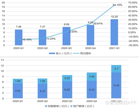 去年第一季度,大部分行业都受到疫情影响,财富管理行业也不例外,抛开同比数据不谈,通过季度环比来看,该公司业绩也基本保持持续上升的态势,资产管理及财富管理业务在2021年加速增长,适应全民投资的大环境。