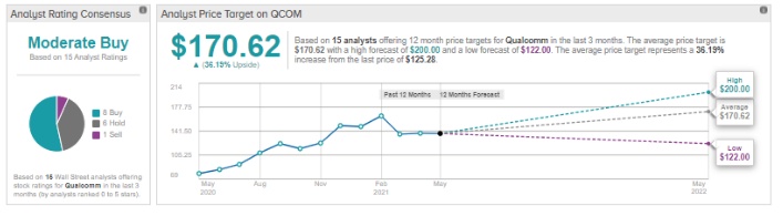 总体而言,华尔街对该股的共识评级为“适度买入”,有8位分析师予以“买入”评级,6位予以“持有”评级,1位予以“卖出”评级,平均目标价位170.62美元,意味着该公司股价未来有约36.2%的上涨空间。