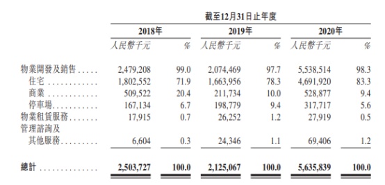 从收入结构来看,中亿基业的营收构成与大多数地产开发商的收入来源无异,物业开发及销售占据了95%以上的收入来源,物业租赁服务和管理咨询及其他服务仅贡献少部分收入。其中,公司的收入主要来自开发及销售住宅物业、商业物业及停车场收入,主要以住宅为主,在2020年内,公司的住宅销售获得了弥足的增长,也同步带动了公司收入的大幅增加。
