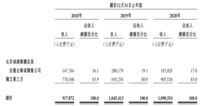 也正是得益于这一身份,京城佳业“近水楼台”拿下鸟巢、胡同等物业项目也顺理成章了。同时,背靠城建集团,也为京城佳业的业绩提供了不少助益。招股书显示,2018年-2020年京城佳业来自于城建集团的收入分别为1.48亿元、2亿元及1.81亿元,占公司总收入的比重为16.1%、19.1%、17%。