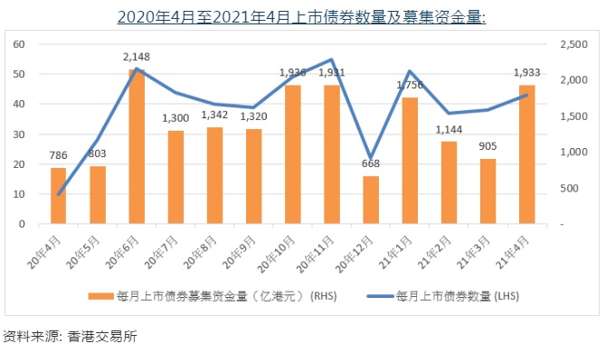 截至四月底,香港交易所上市债券市场存续债券数量达到1656只,较去年同期增加约18%;市场规模已超过6万亿港元。