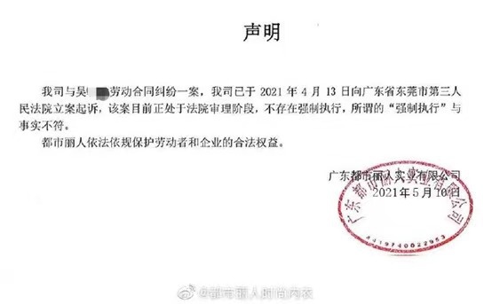 当日,都市丽人通过其官方微博声明,“该案目前处于法院审理阶段,不存在强制执行,所谓强制执行与事实不符”。