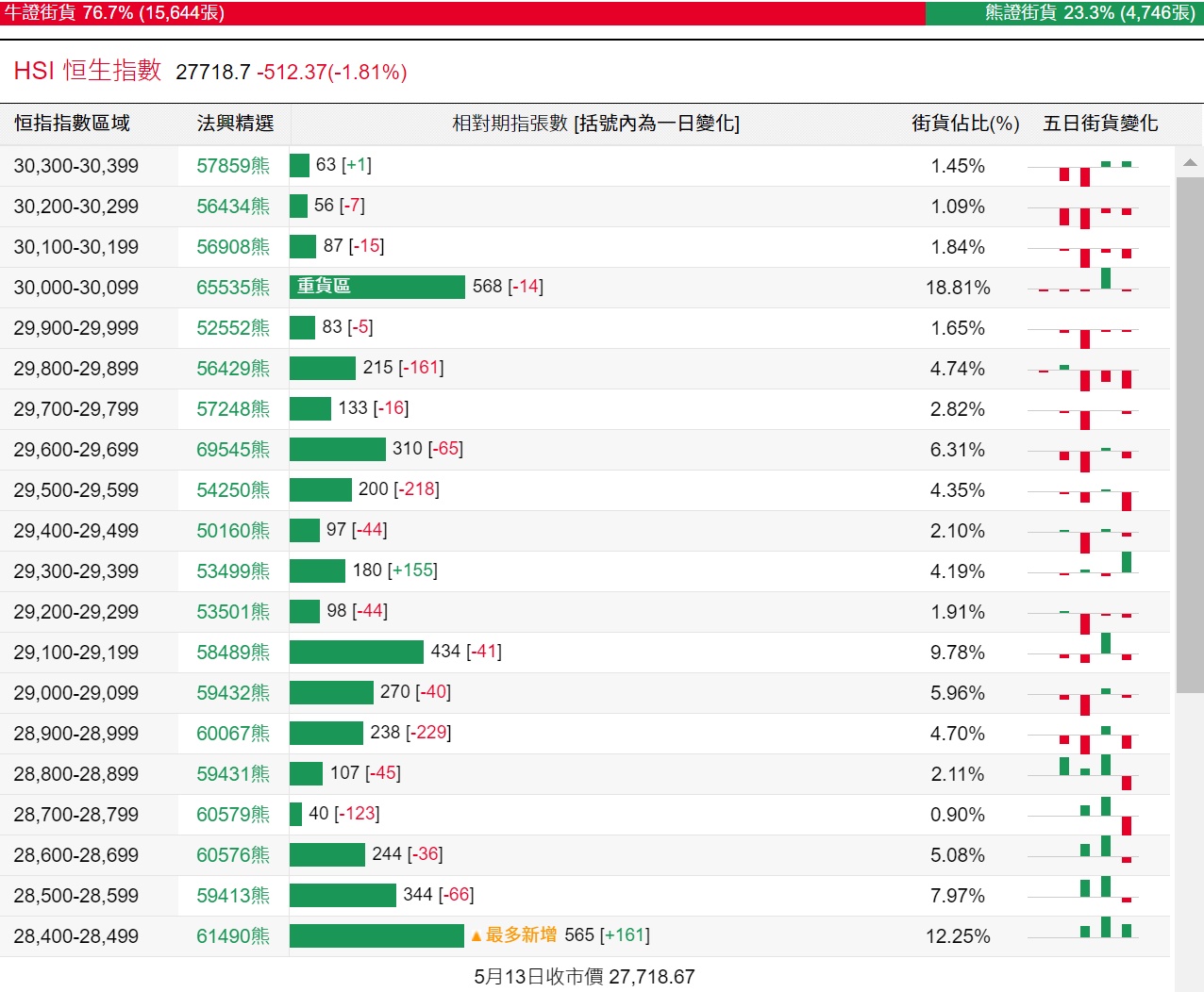 智通财经APP获悉,截至5月13日,恒指最新的牛熊街货比例为77:23。
