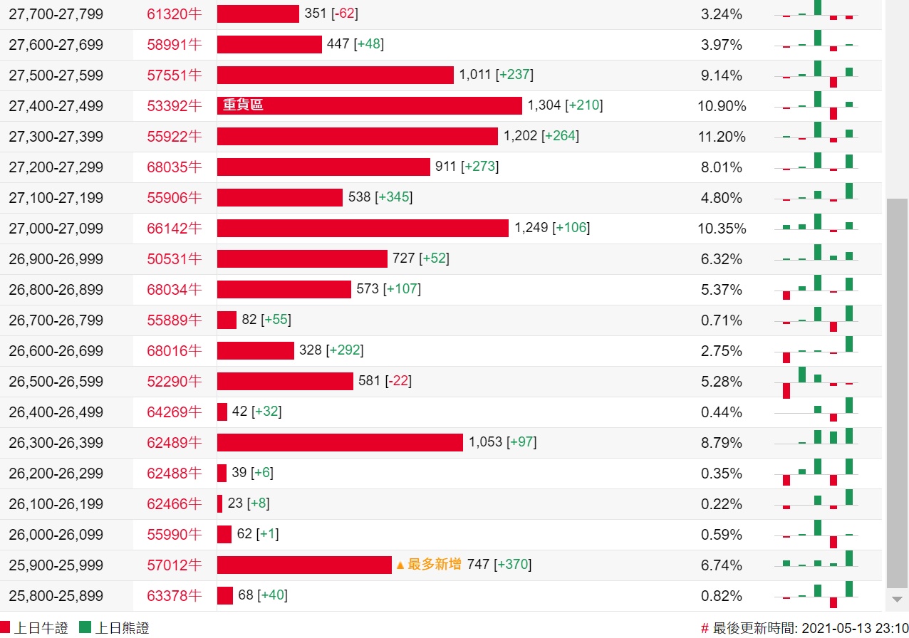 牛证街货重货区在27400-27499区间,该区间最新牛证数量为1304张,较上一交易日增加210张;最多新增在25900-25999区间,该区间最新牛证数量为747张,较上一交易日增加370张。